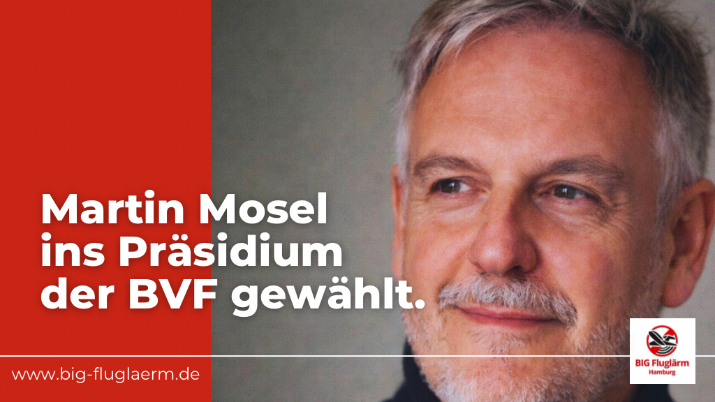 Auf der Mitgliederversammlung der Bundesvereinigung gegen Fluglärm (BVF) am 17. April 2026 in Frankfurt am Main wurde Martin Mosel, Vorsitzender des Umweltverbands BIG Fluglärm in Hamburg, in das Präsidium der BVF gewählt.